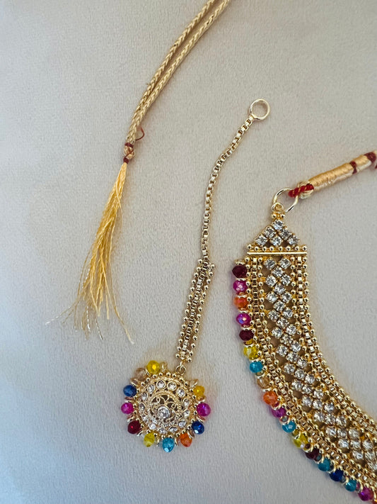 Gold & Multicoloured Jewellery Set With Round Bindi