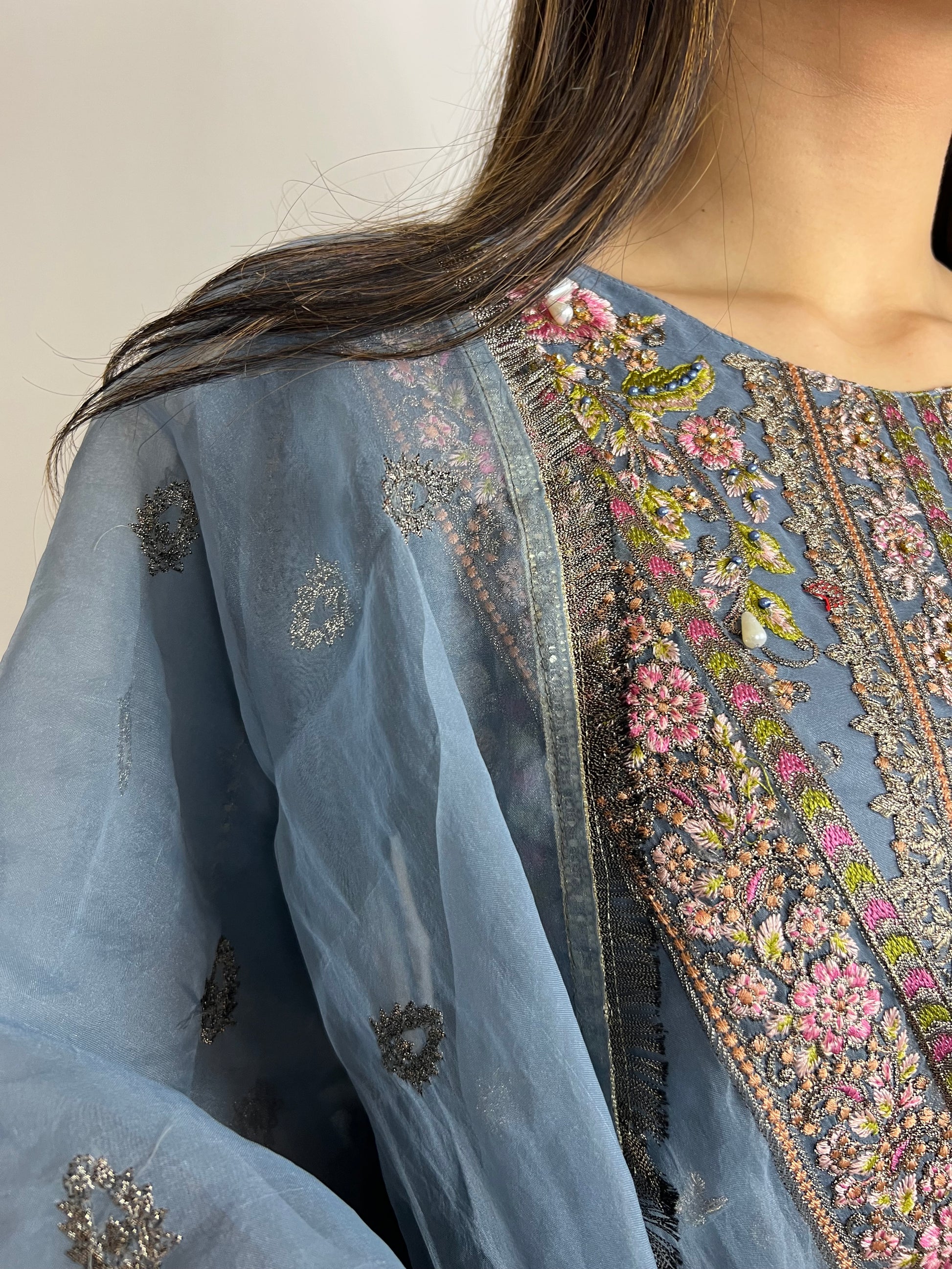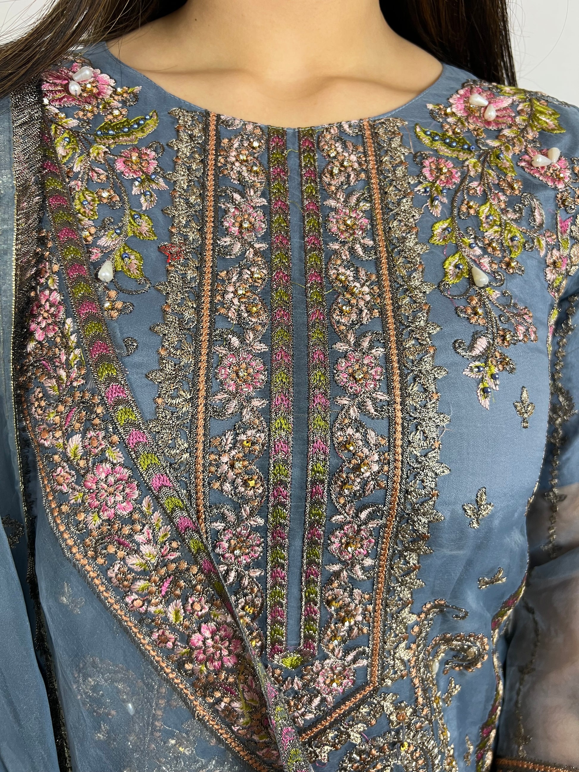 The Raha collection of embellished Salwar Suit strikes all the right chords when it comes to making an unparalleled style statement! The embellished kameez is delicately adorned with gold zaari embroidery across the suit, with soft light pink and gold colours, matched with elegant pleated sleeves. The salwar has been composed with a comfortable stitched satin material, and embroidered cuffs. The set has been completed with an alluring organza dupatta with zaari buttis. A bail of matching embroidered detailing across the two sided border paralleled with fringe borders for a playful look.