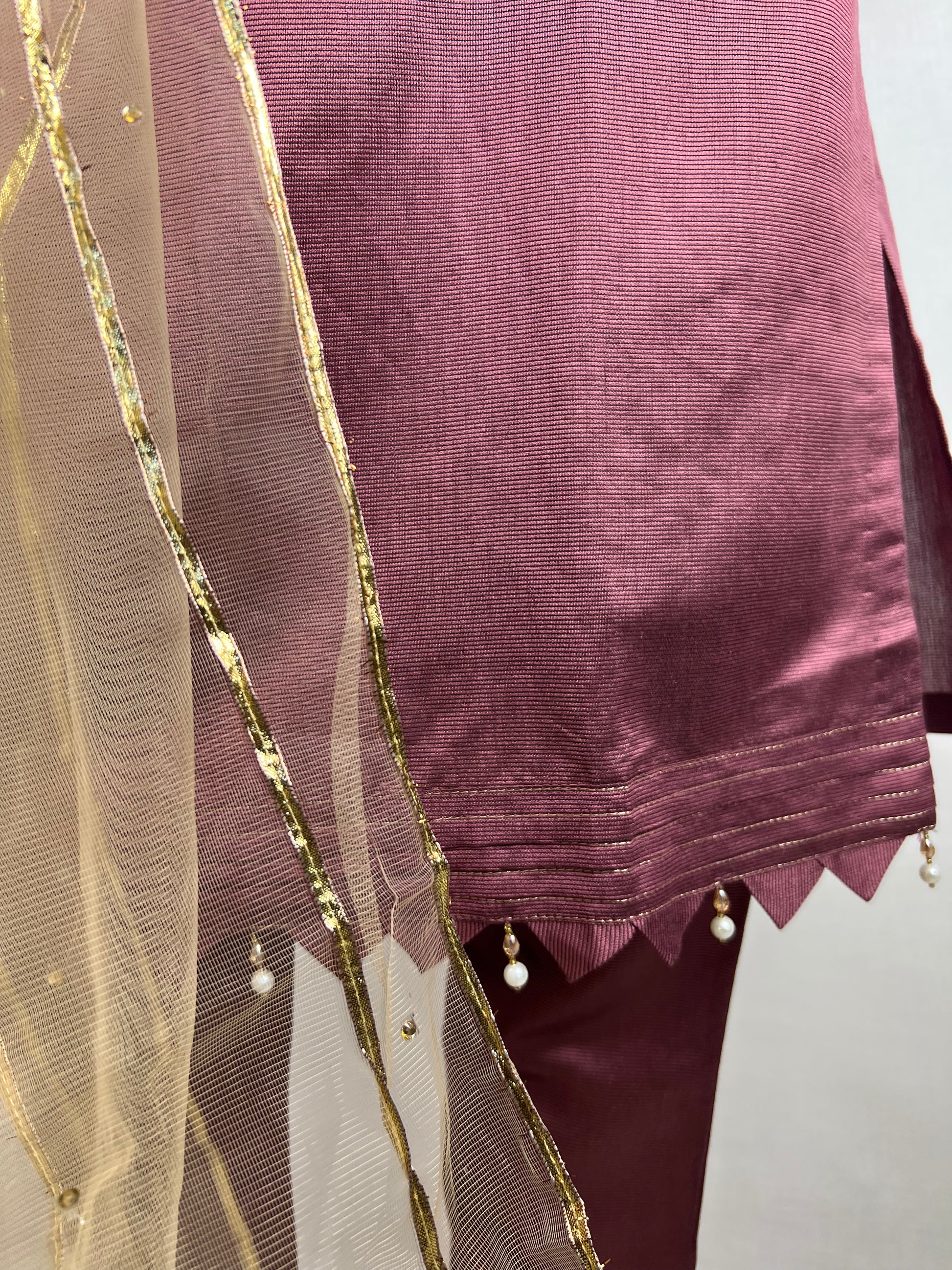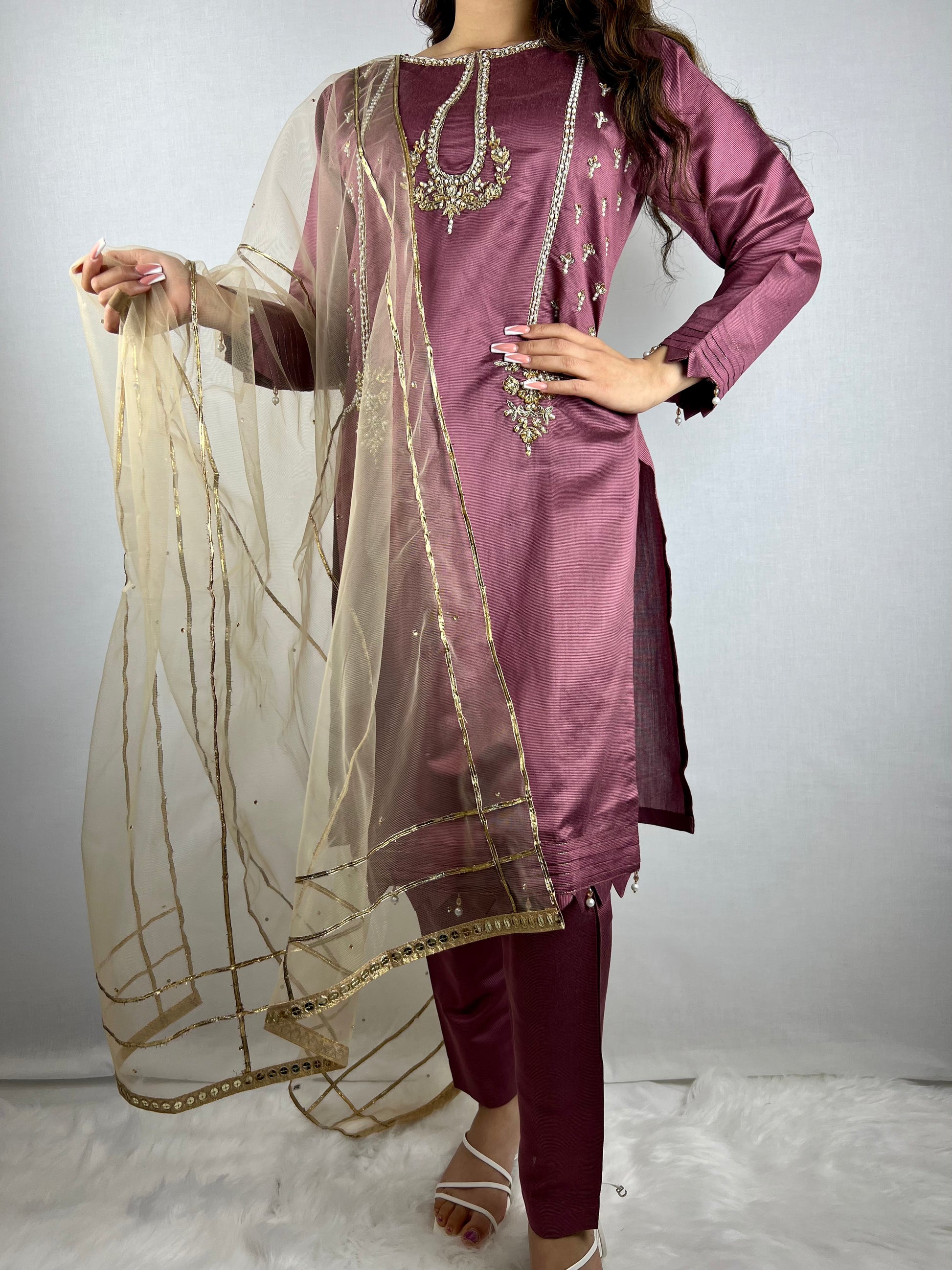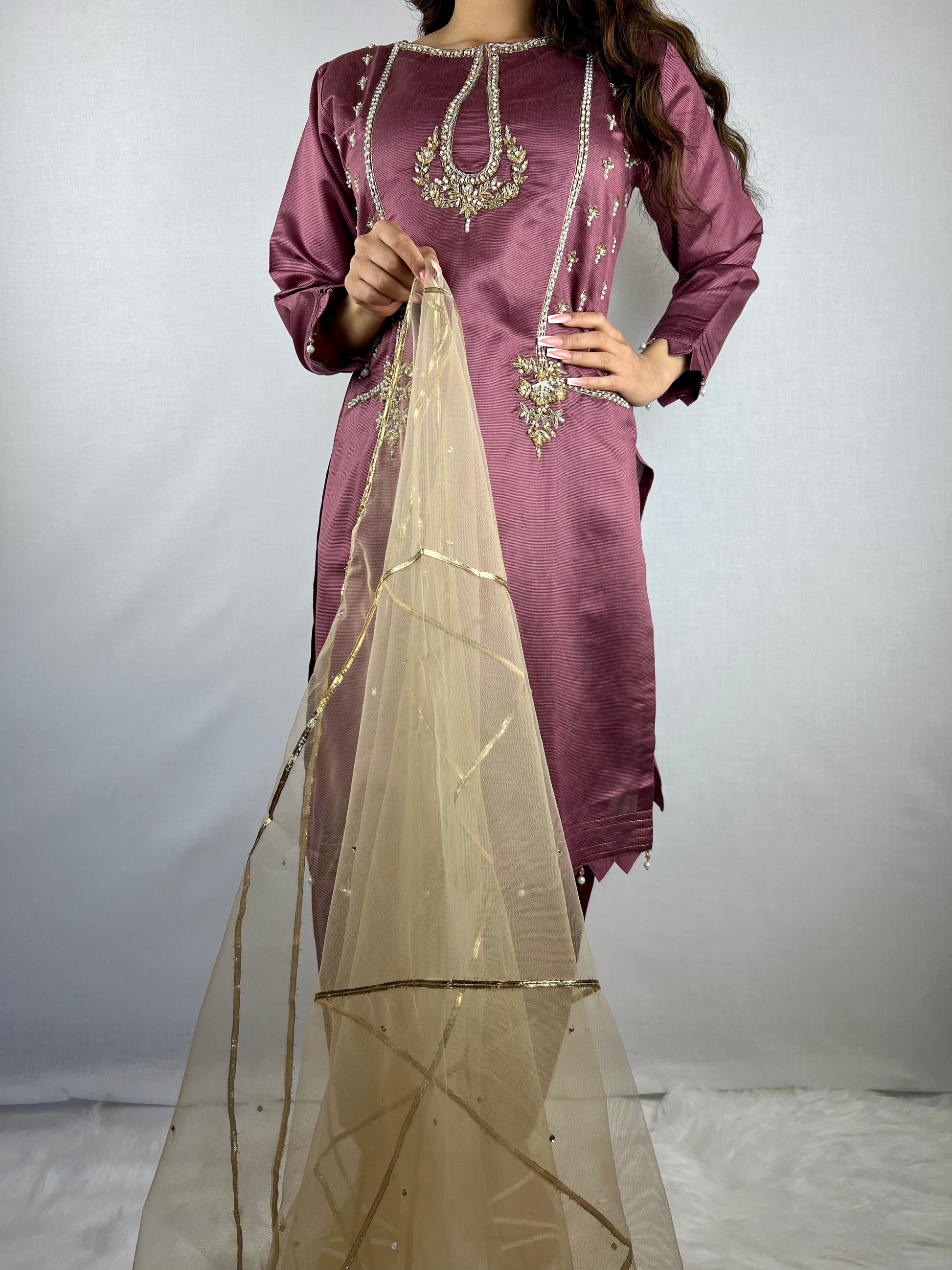 Create a star-studded simplistic look with our comfortable Tara Collection. Available in a stunning purple, with light beaded embroidery, salwar and matching dupatta.