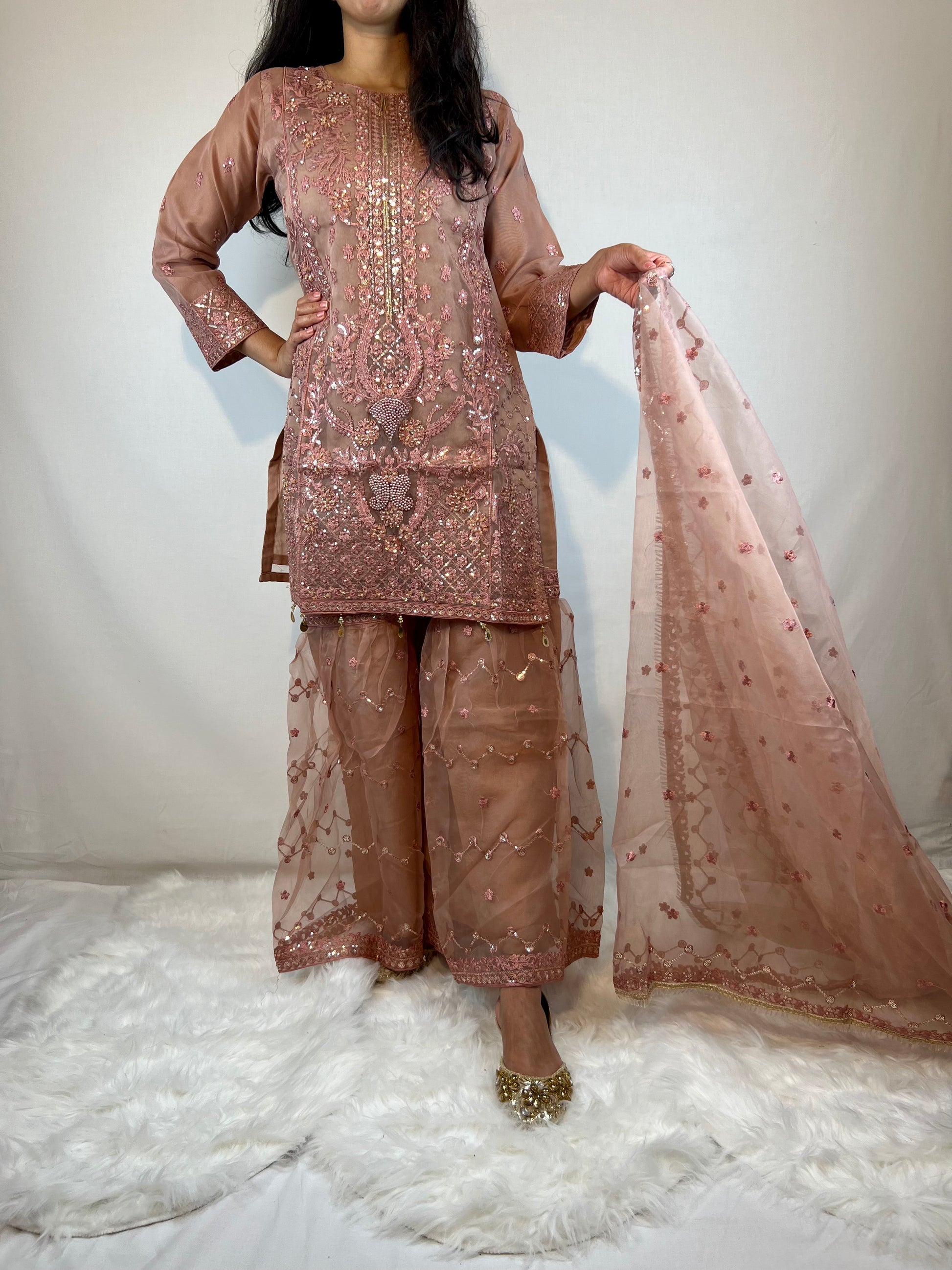 Sparkle in this gorgeous Sharara from our Husna Collection, complete with a stunning embroidered kameez, dazzling Sharara pants and an embroidered dupatta to create all the flair.