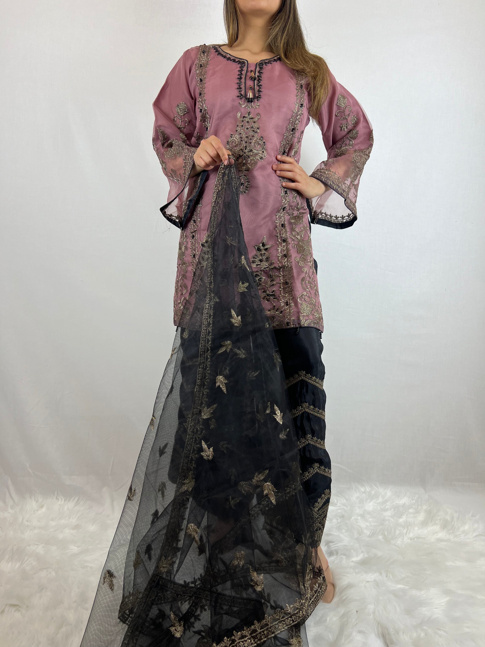 Our Kajol collection features the perfect traditional outfit. Featuring zardorzi embroidery, wide length black trousers and an organza dupatta.