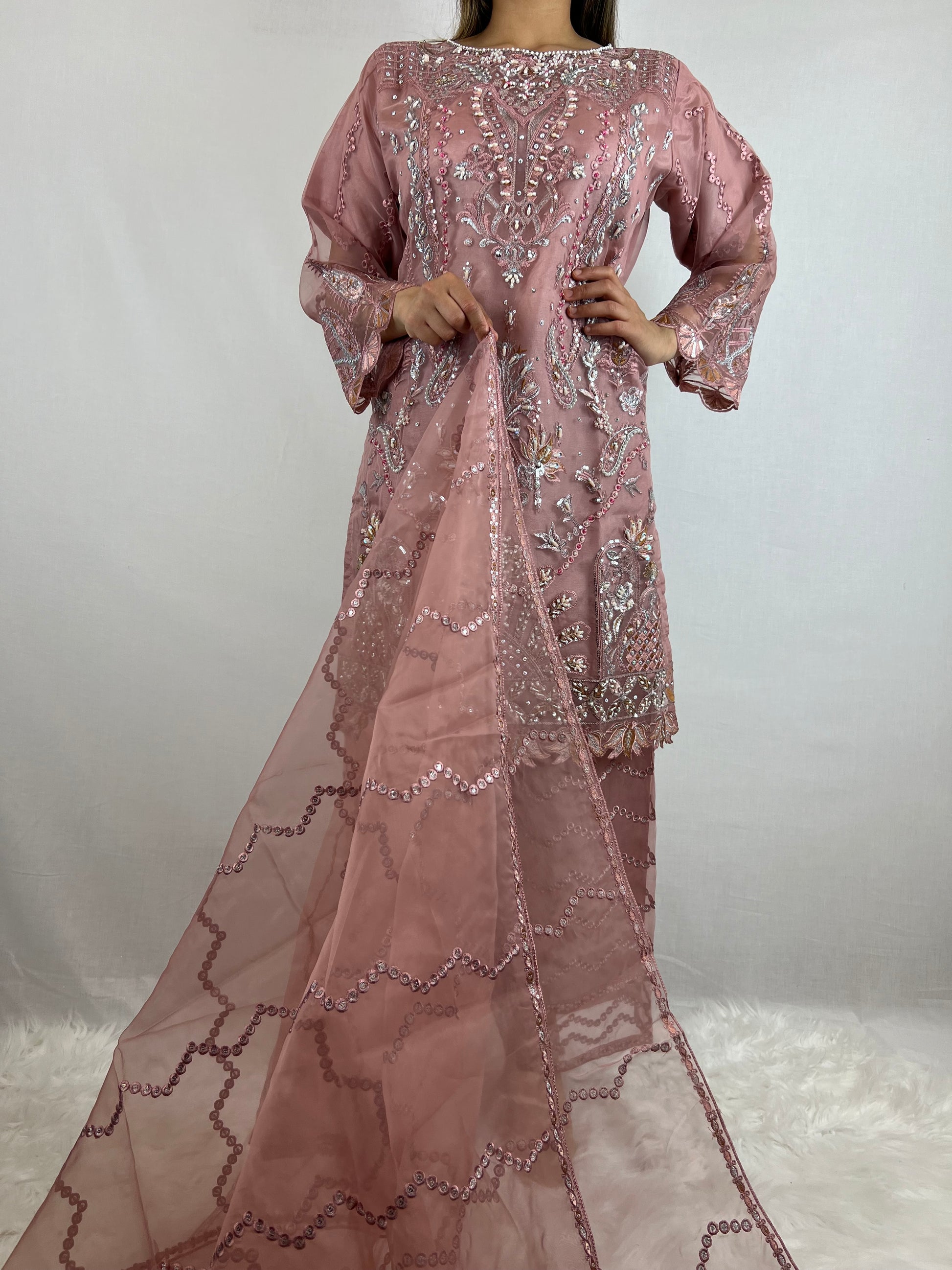 Get ready to sparkle in this fabulous dress from our Kismat Collection. Featuring Zardozi embroidery, palazzo trousers and dupatta with detailing.