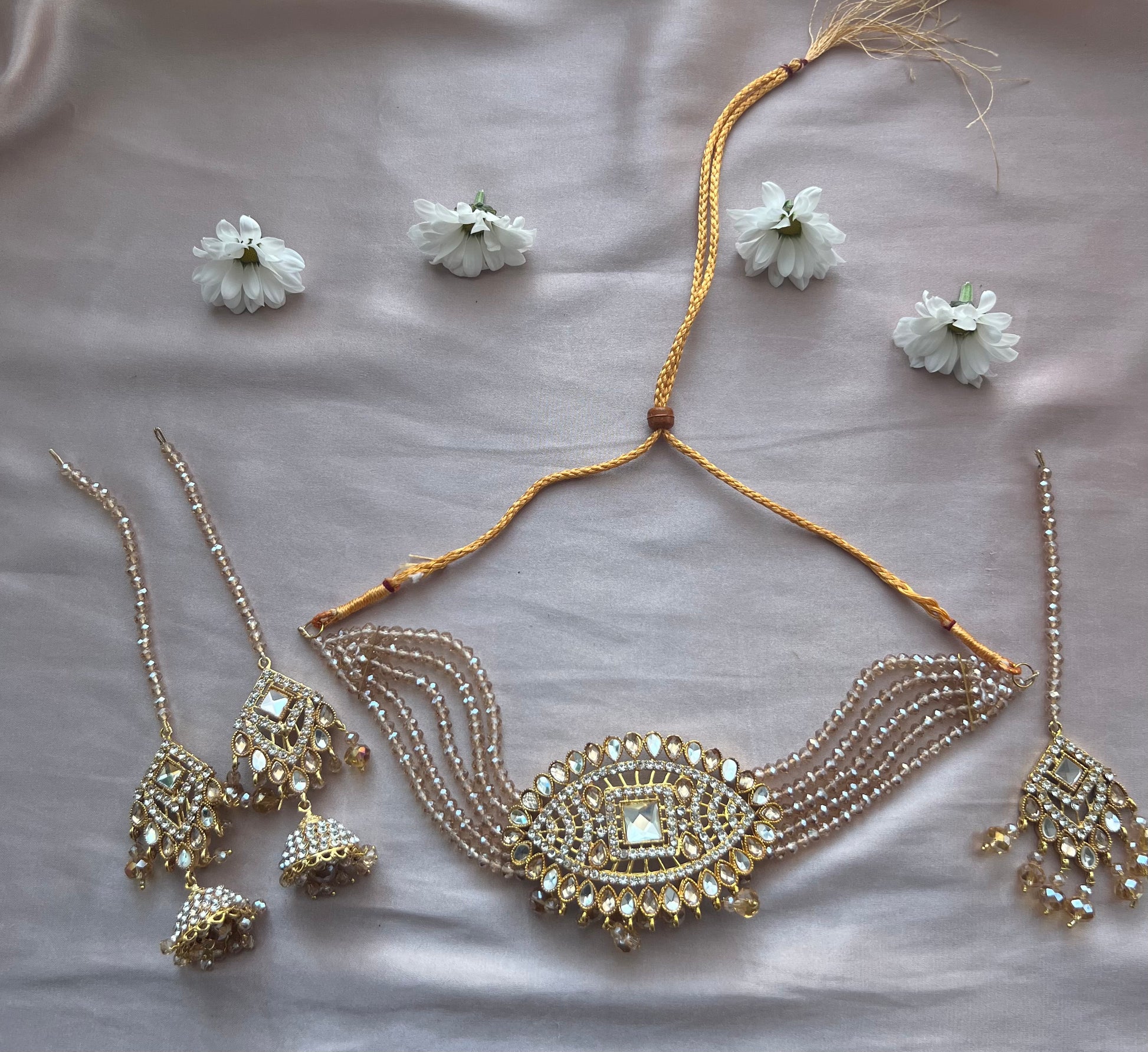 Details: Introducing this stunning set featuring dangly earrings , a choker necklace & bindi. Each piece is adorned with gorgeous beads.