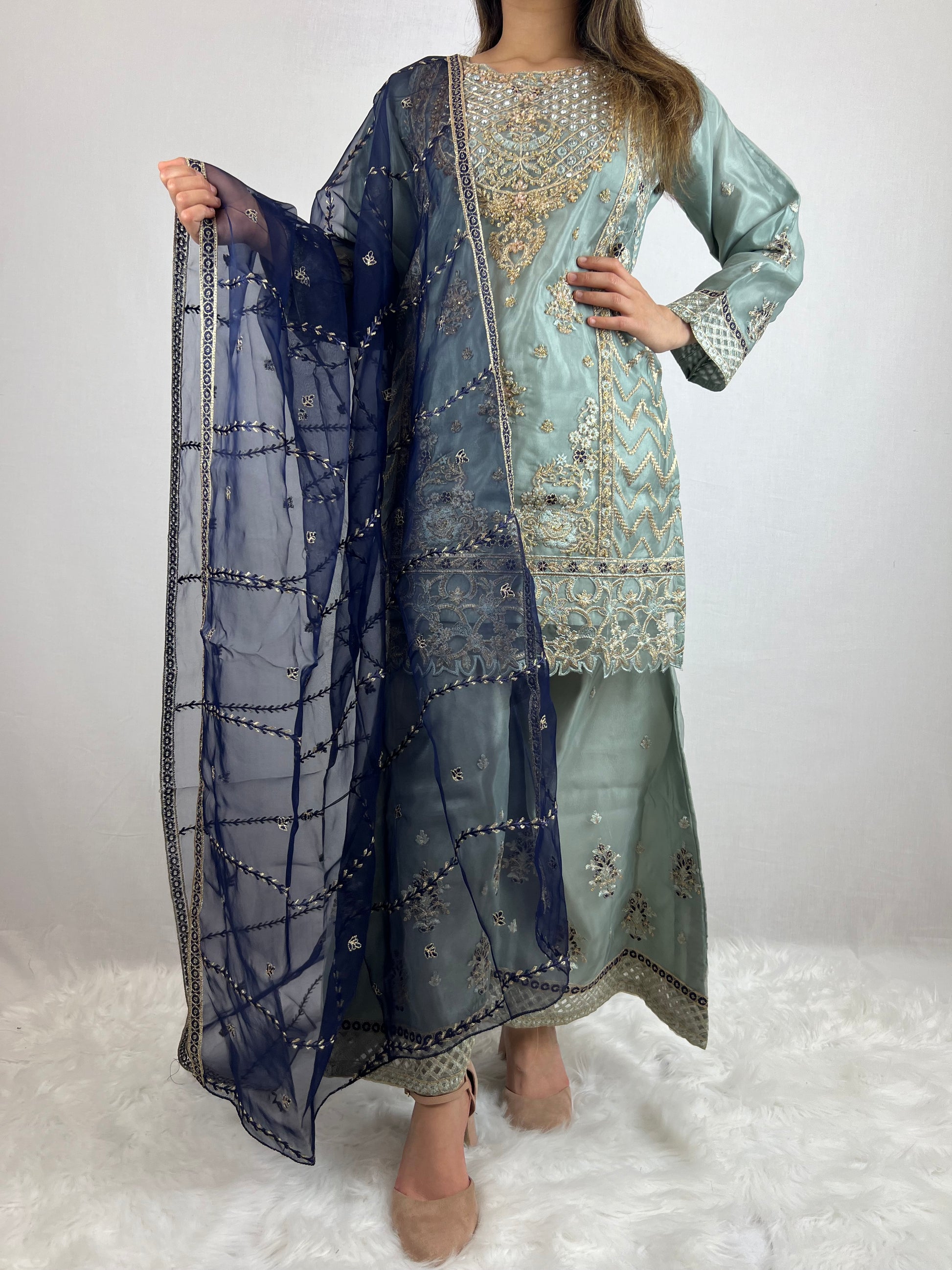 Step into style with this dazzling suit from our Eesha Collection. Featuring intricate embroidery, a contrasting colour dupatta, zig zag piping and wide trousers.