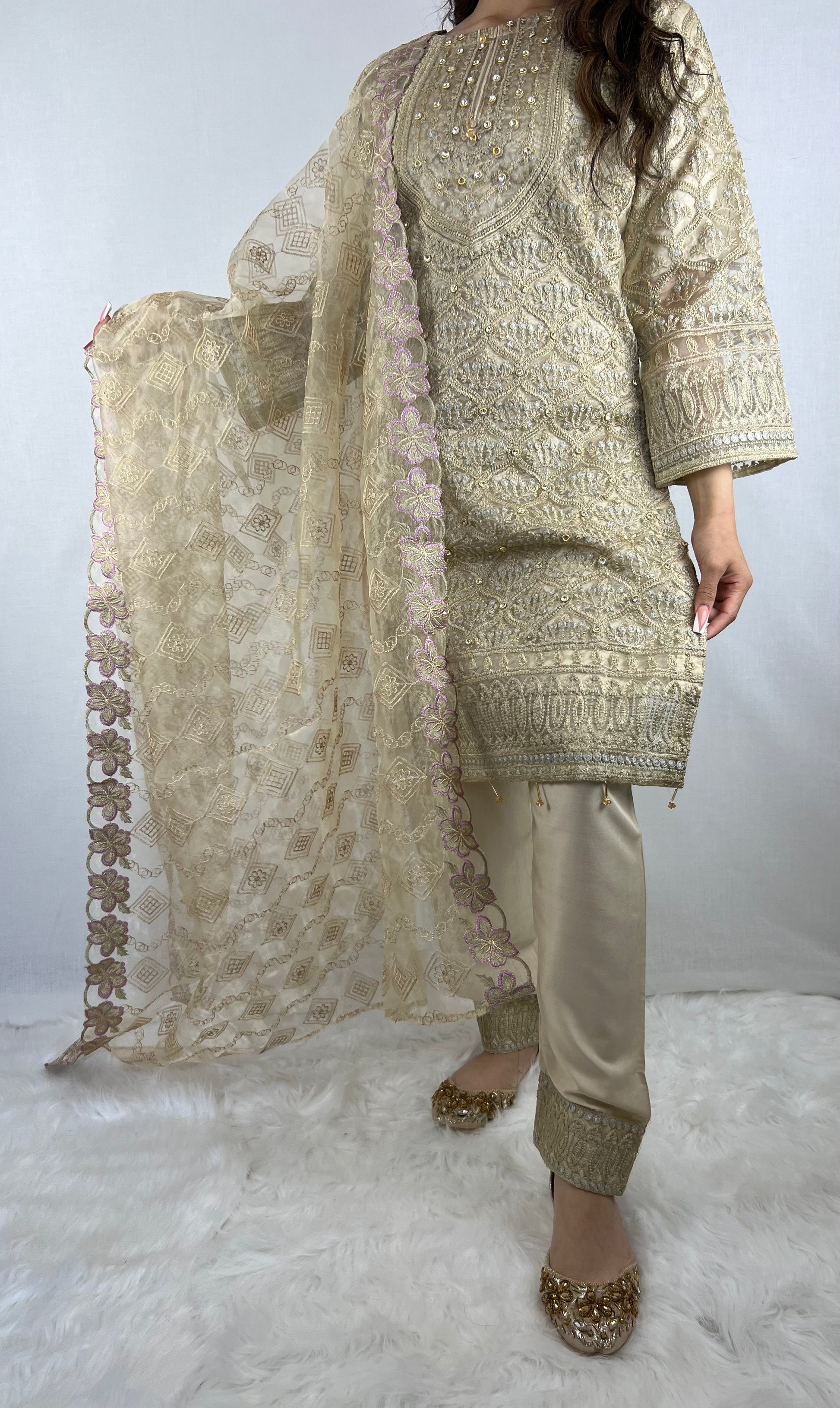 Light Gold Salwar Kameez With Floral Dupatta