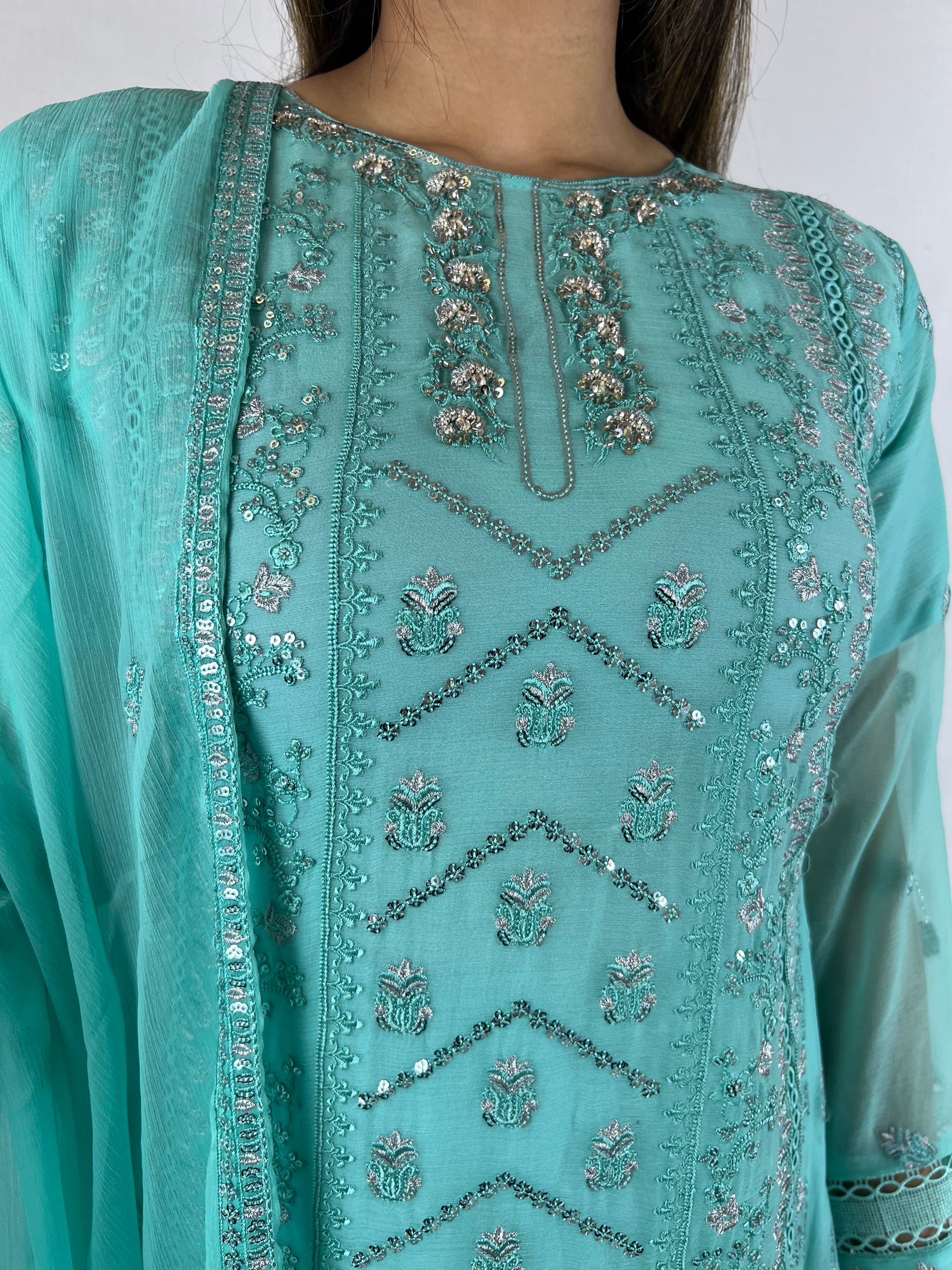 Get ready to sparkle in this fabulous Sharara Dress from our Maha Collection. Featuring Zardozi embroidery, sharara trousers and dupatta with detailing.