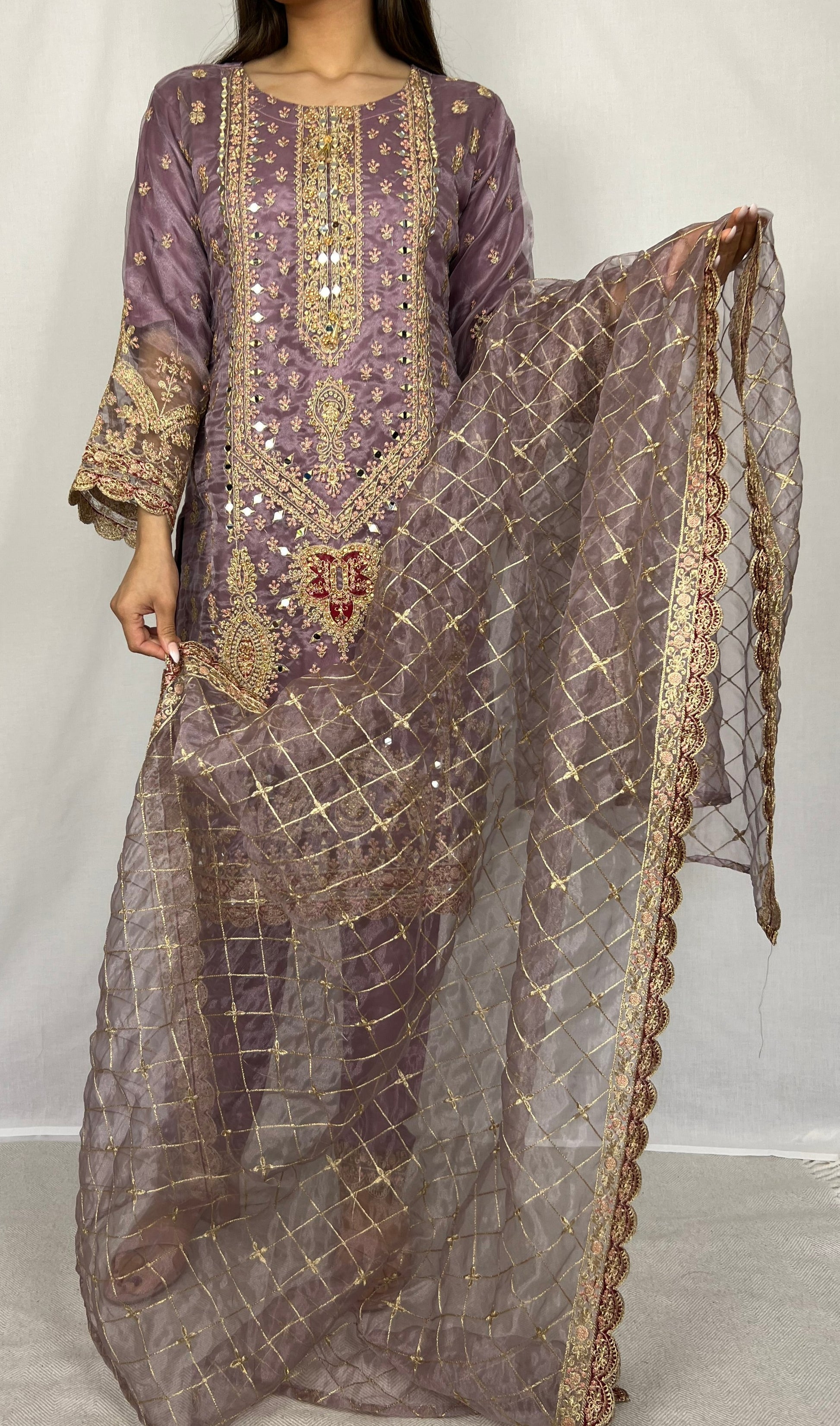 Featuring a sleek and modern design, this royal straight suit is adorned with intricate zardozi embroidery and a gold-piped organza dupatta with a lace border finish. Comfortable yet elegant, this suit is perfect for both formal functions and casual parties.