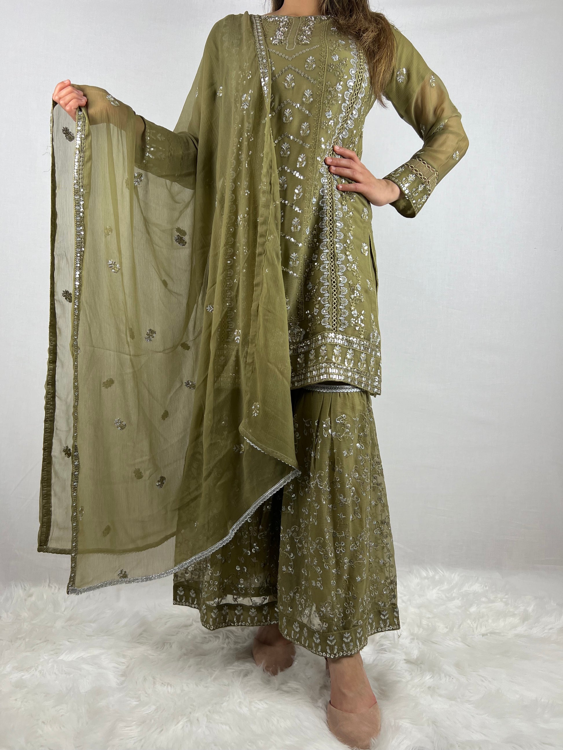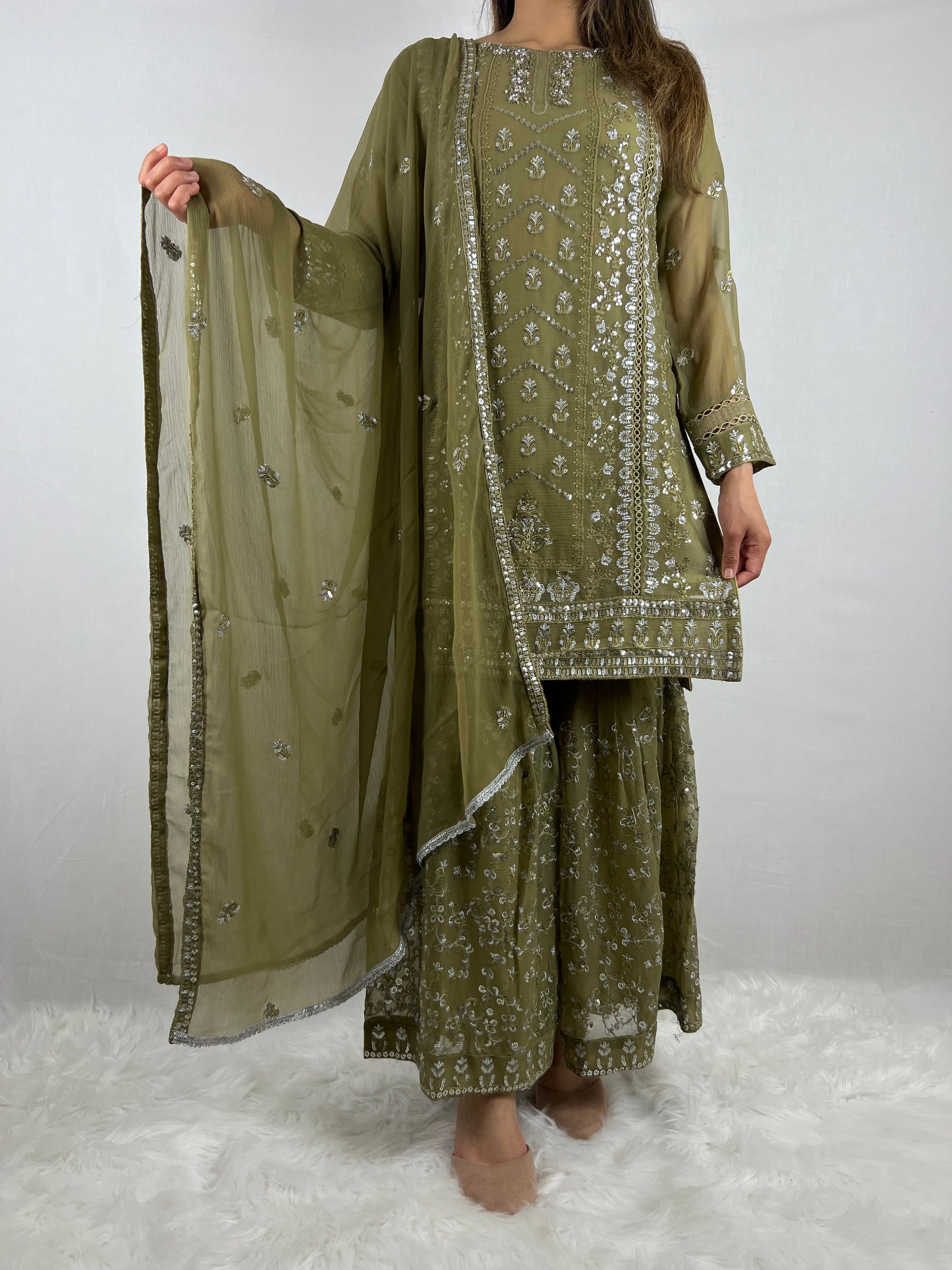 Mehndi Green Chiffon Sharara Suit