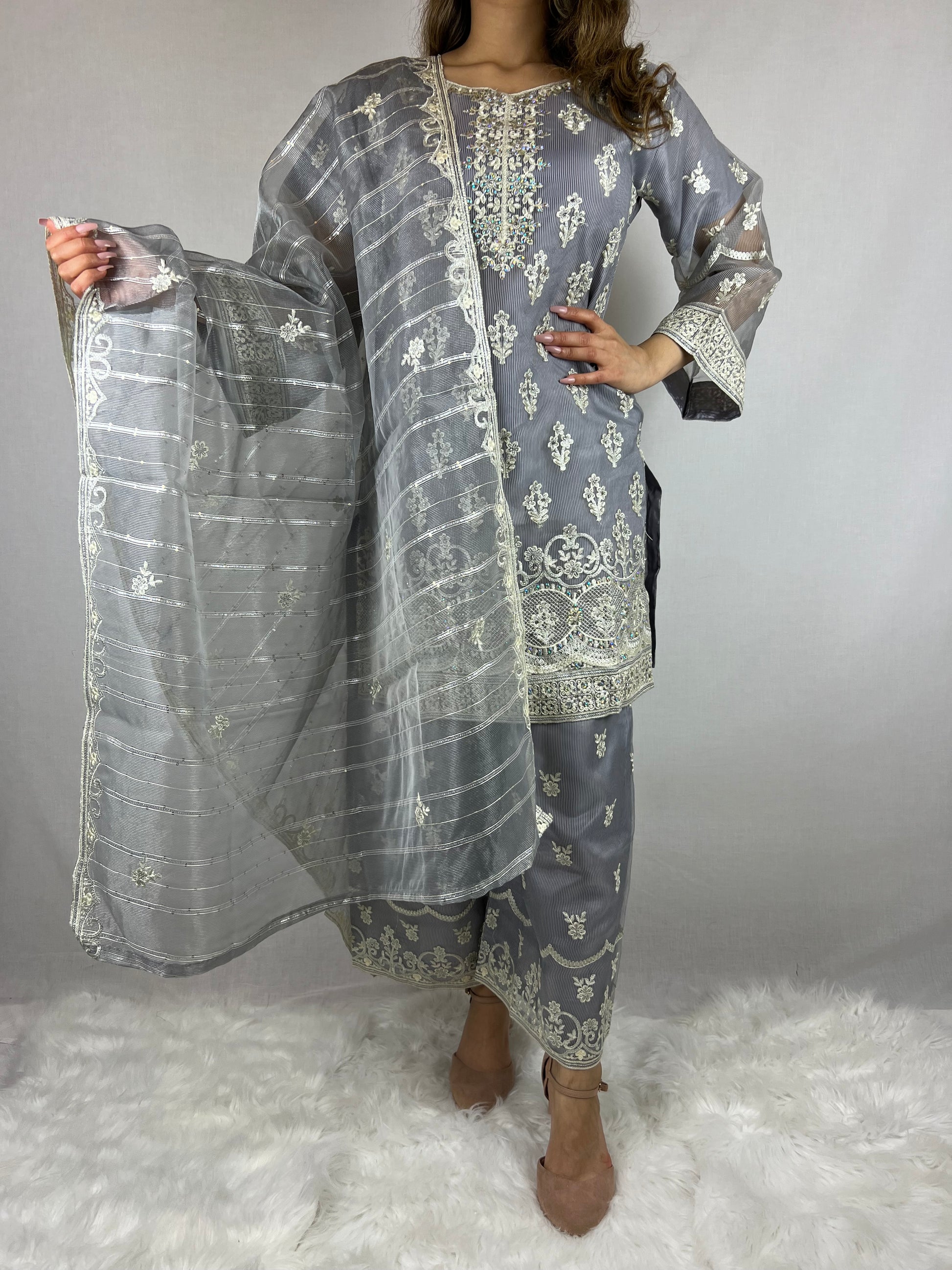 Get ready to sparkle in this fabulous Palazzo Dress from our Pakeezah Collection. Featuring white embroidery, iridescent beads, palazzo trousers and organza dupatta with stripe detailing.