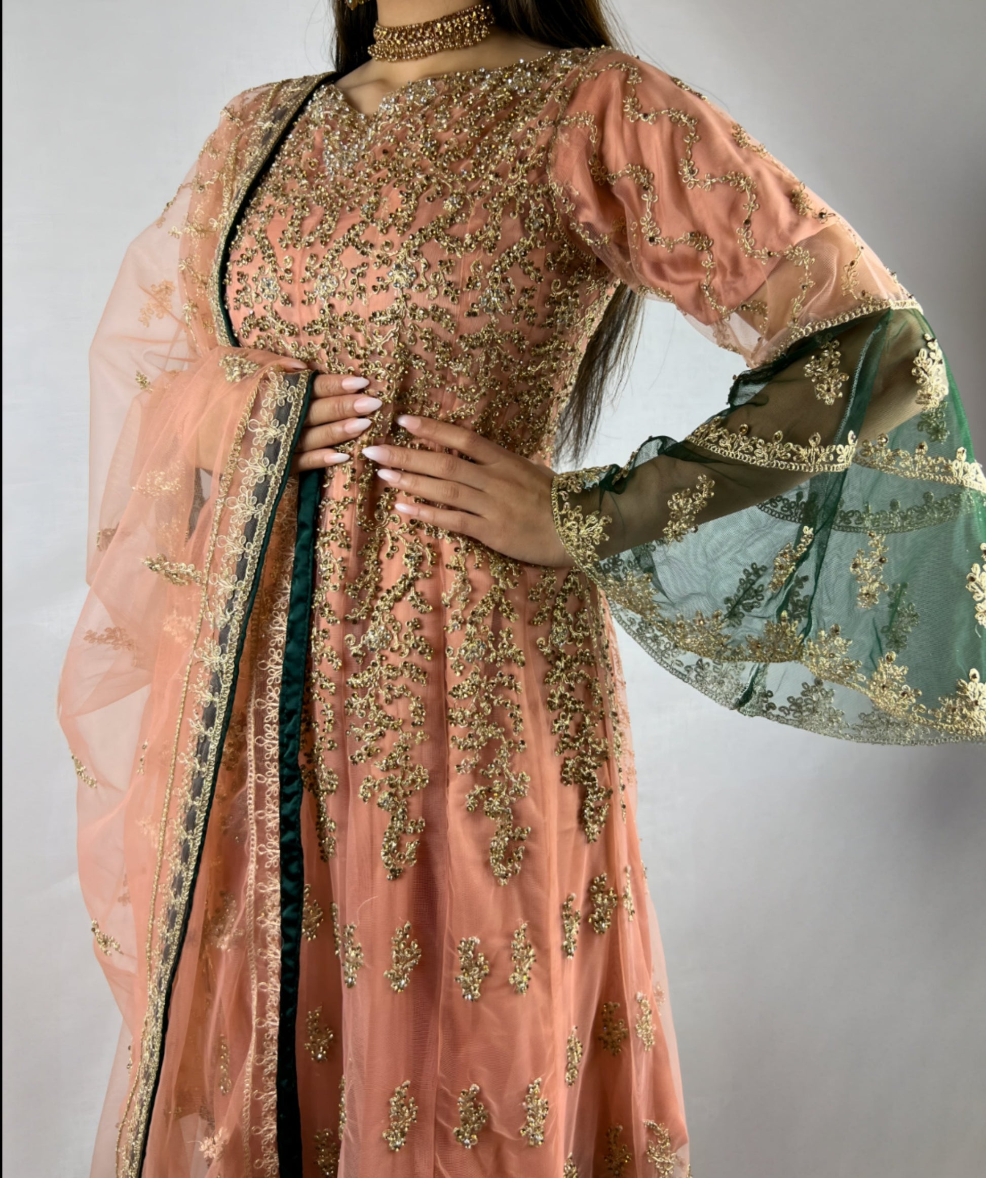 Details - Zari embroidery, flared contrasting sleeves, satin trousers, zari embellished chiffon dupatta