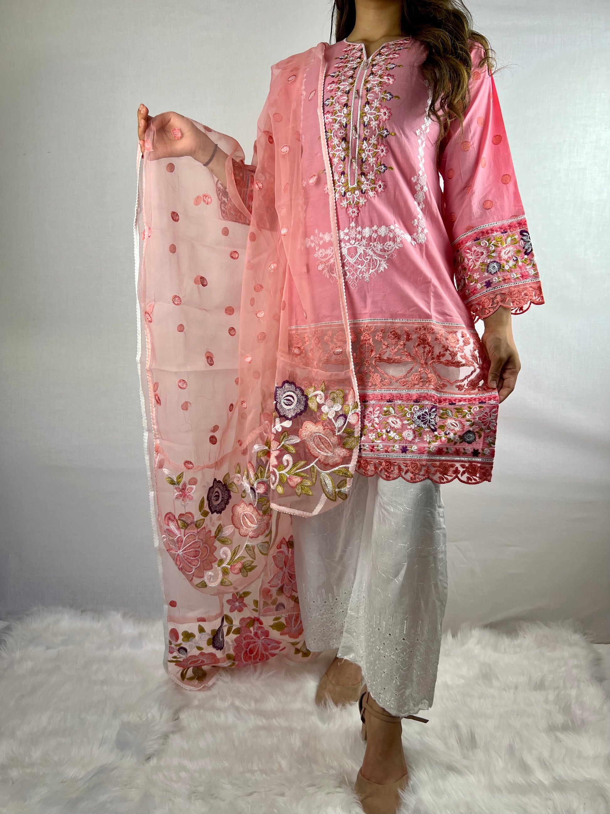 This lightweight salwar kameez blooms with colourful floral embroidery, making it the perfect addition to your warm-weather wardrobe!