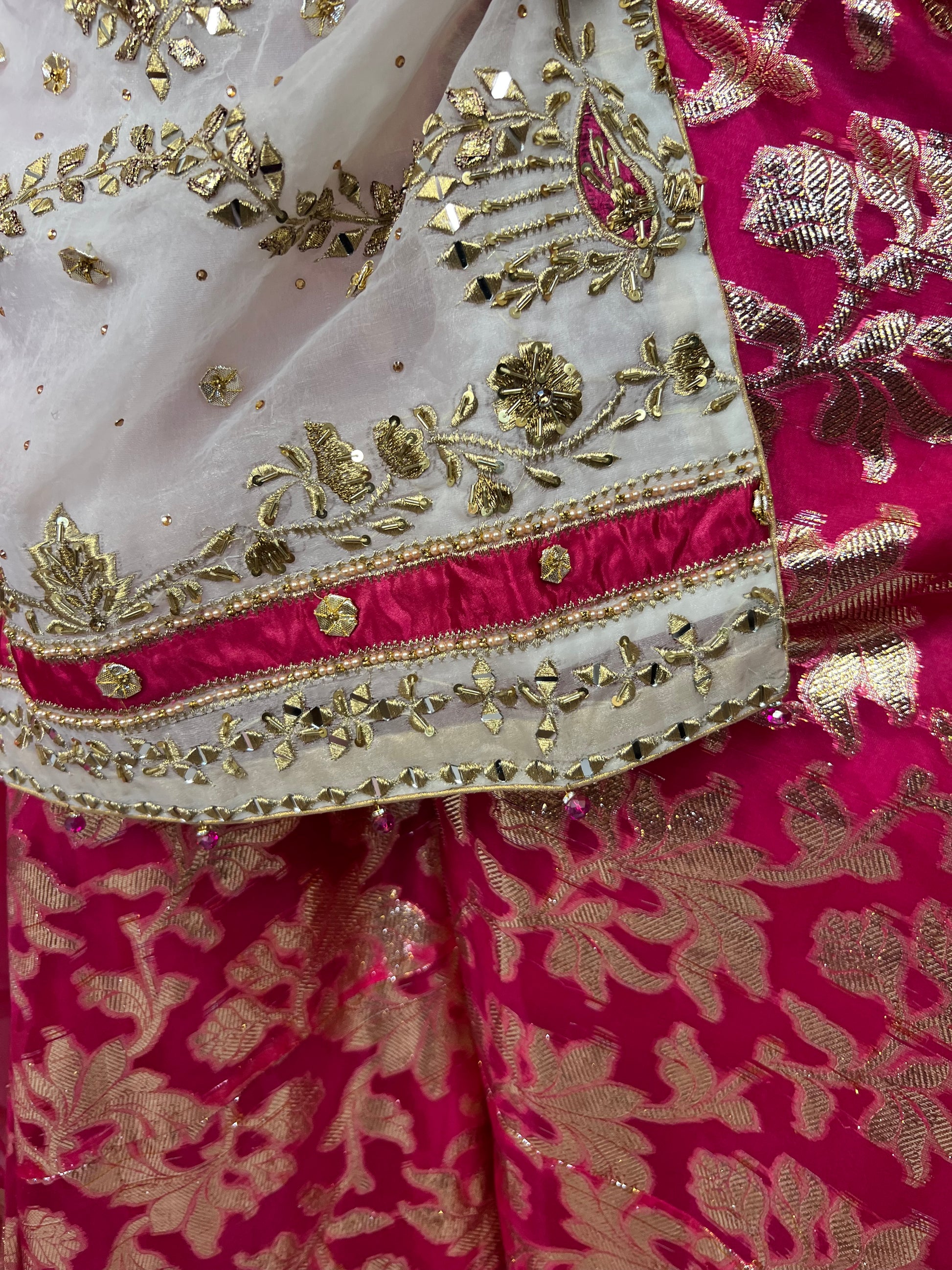 Ready to make a statement? Be bold and daring in this vibrant white & hot Pink Mehndi Gharara Suit! The organza kameez and hot pink dupatta with gold tassels merge cultural style with fun! Feel confident and fearless in this lined fabric, and make a statement like no other.