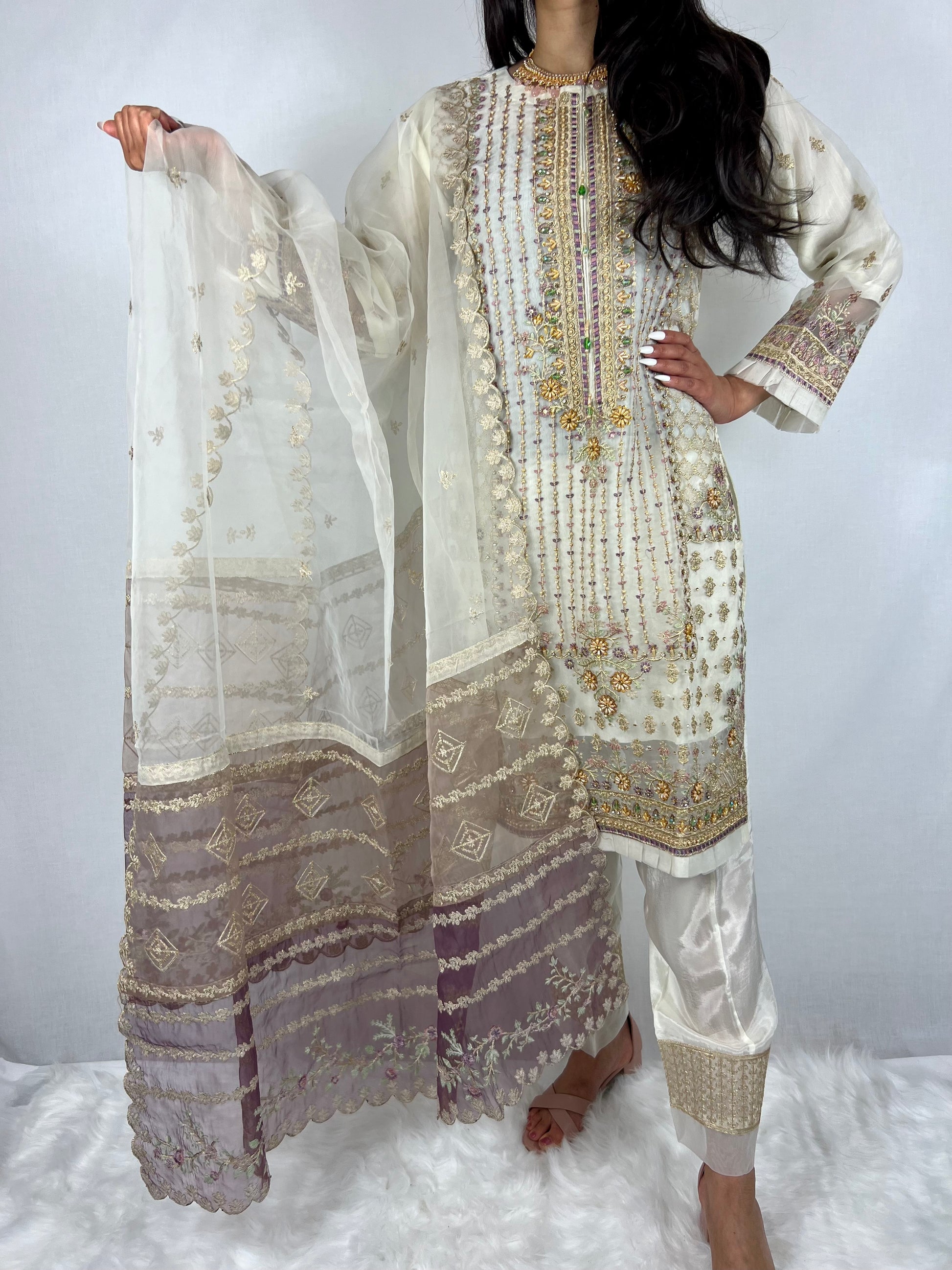 Step into the summer season with this effortlessly chic cream Salwar Suit from our Talat Collection. The stunning purple accents add a pop of colour to the understated cream base, creating a beautifully balanced look. The lightweight fabric and comfortable fit of the Salwar Suit make it a perfect choice for any occasion!