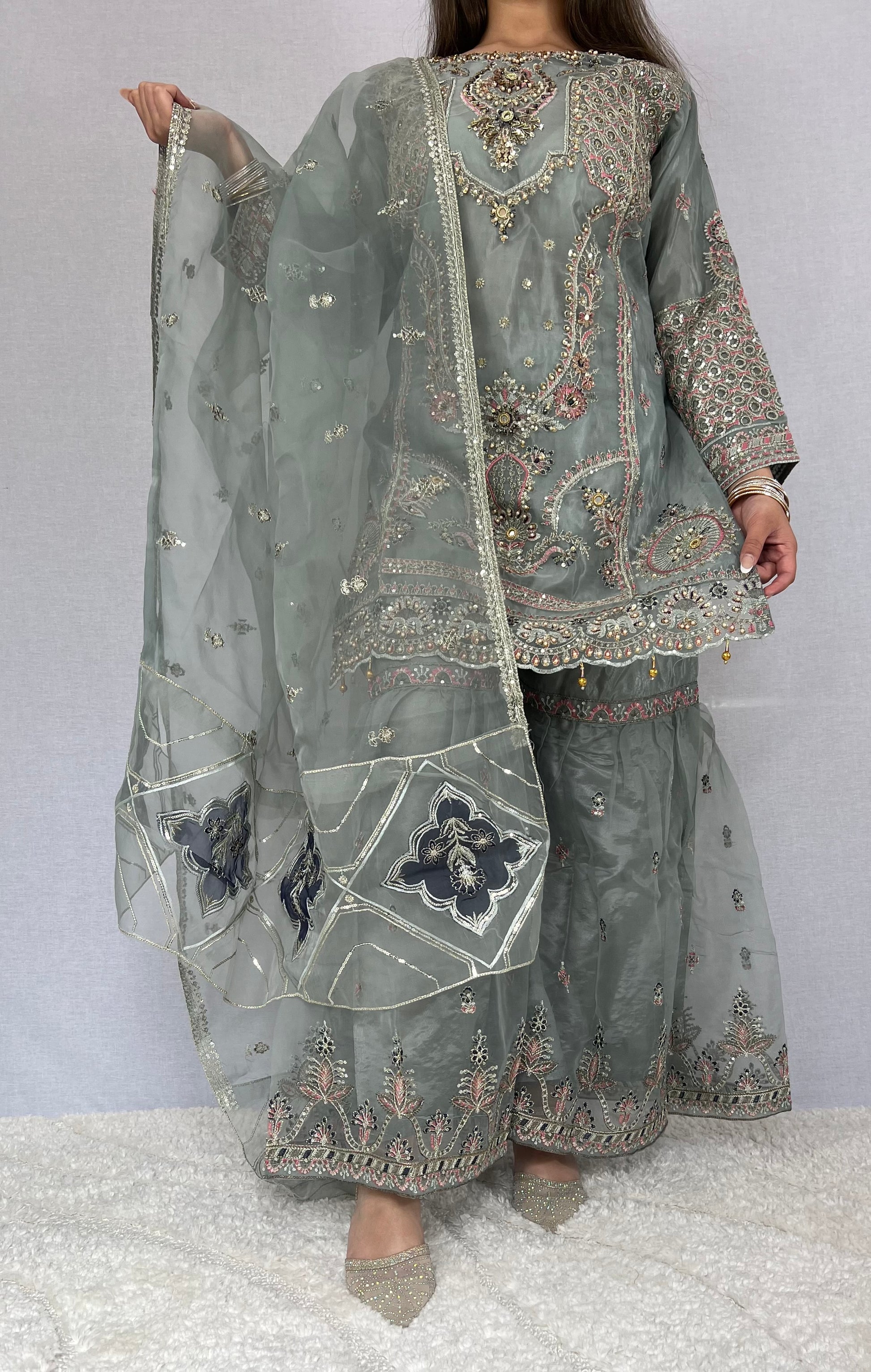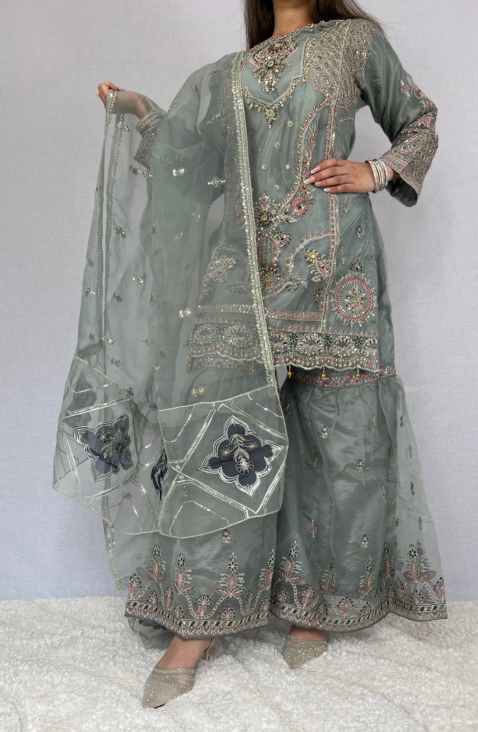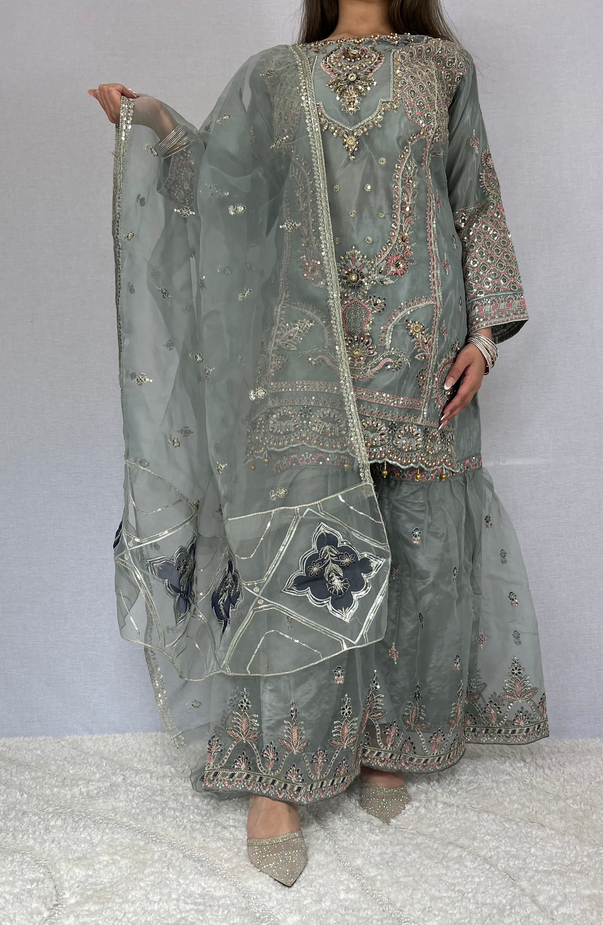 Beautifully adorned with intricate silver and iridescent embroidery, this ensemble catches the light with every movement, creating a subtle shimmer that feels both luxurious and refined. The detailed craftsmanship enhances the silhouette while maintaining a graceful, sophisticated finish.