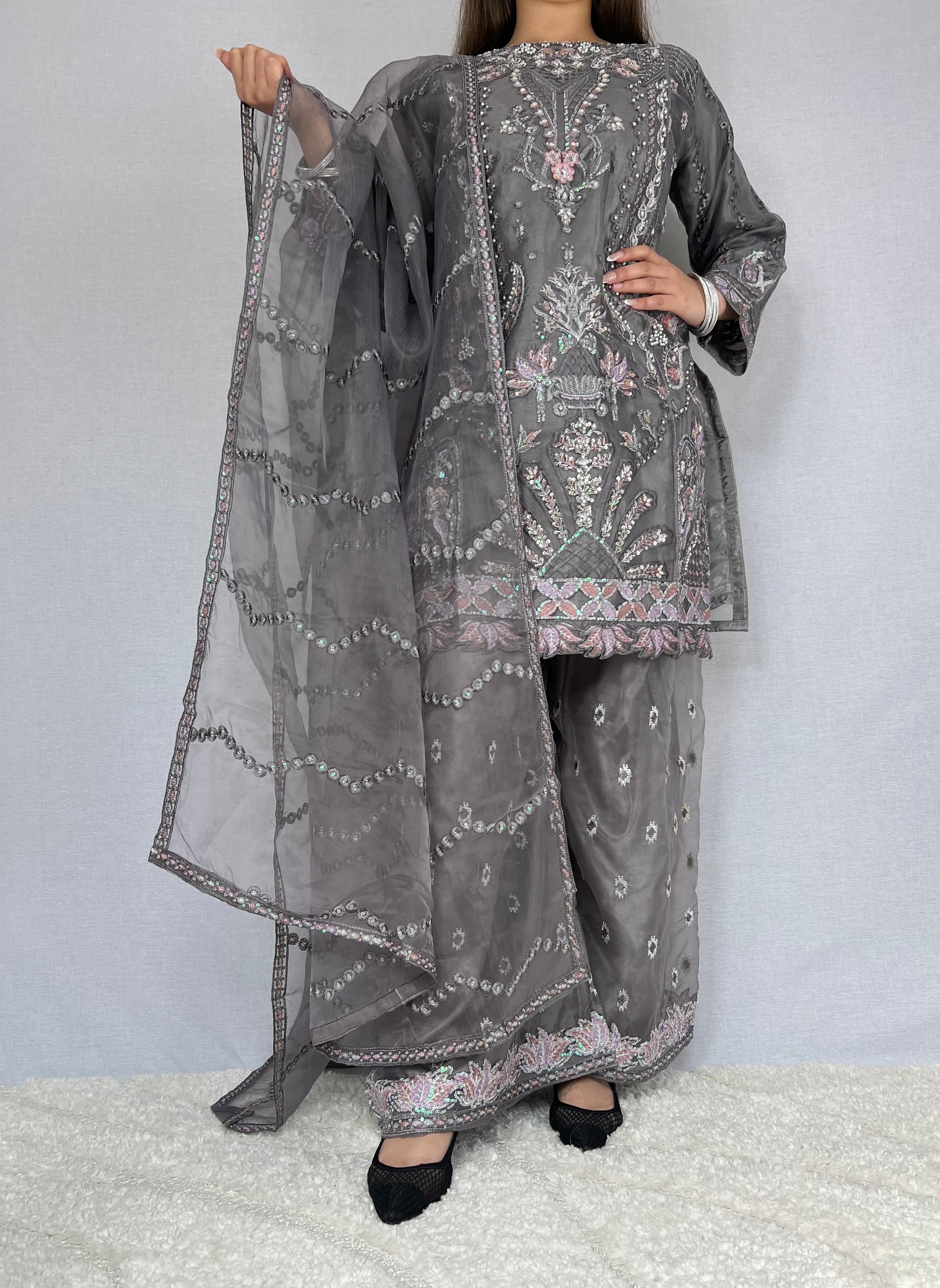 Beautifully adorned with intricate silver and iridescent embroidery, this ensemble catches the light with every movement, creating a subtle shimmer that feels both luxurious and refined. The detailed craftsmanship enhances the silhouette while maintaining a graceful, sophisticated finish.
