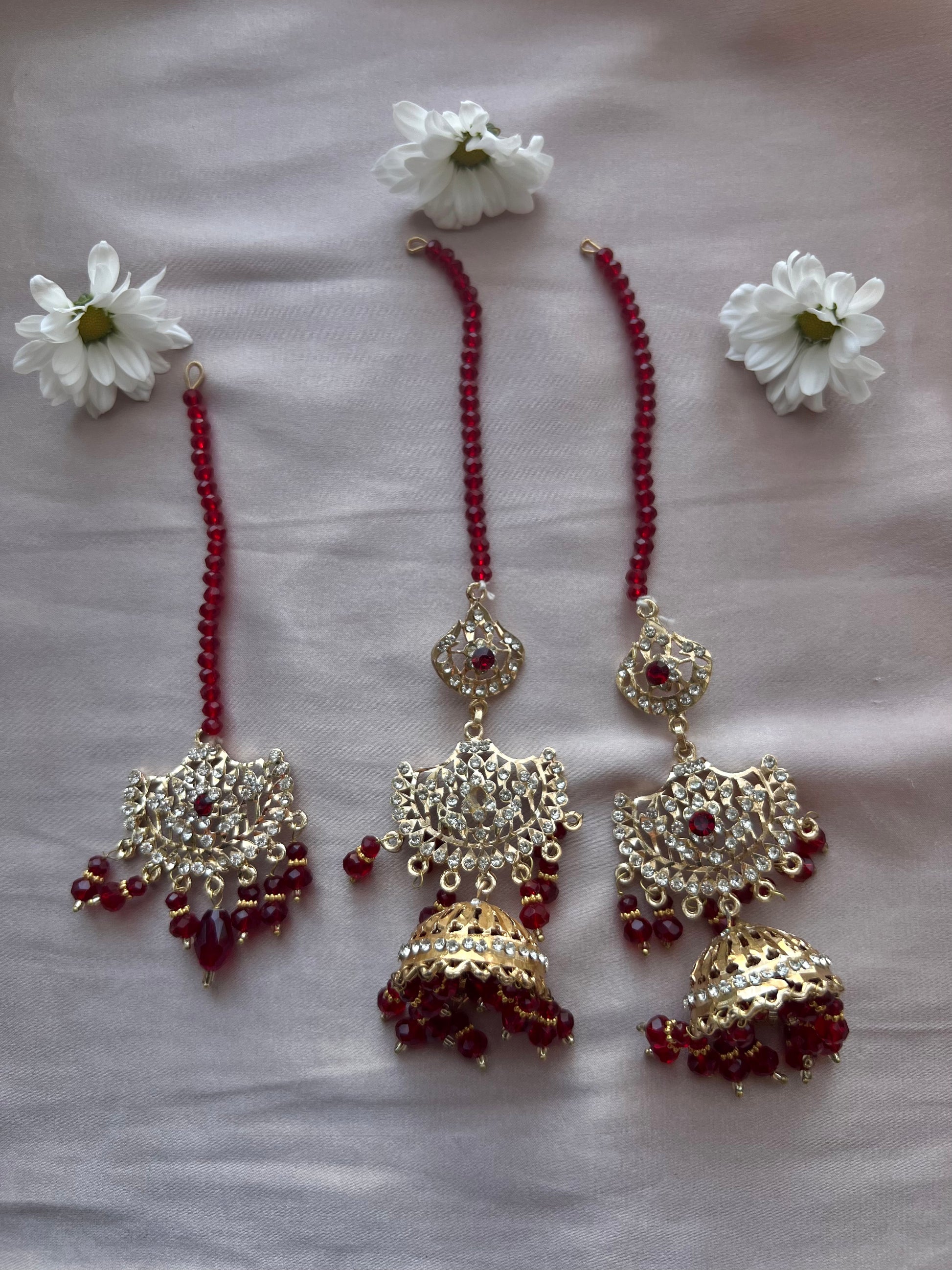Details: Introducing this stunning set featuring dangly earrings , necklace & bindi. Each piece is adorned with stunning red beads.
